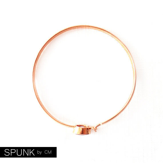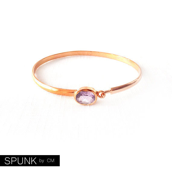 This minimalist bangle bracelet features warm copper metal that has been hammered, shaped, and accented with a single, faceted amethyst gemstone. The warm copper and cool purple amethyst are a gorgeous combination. For a simple and elegant style, wear this bangle alone. For an ultra-chic and luxurious style, layer this bangle with other bangles. This bangle is easy to wear with a comfortable latch-hook closure. Amethyst is the February birthstone, which would make this a wonderful birthstone gift.