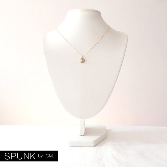 This simple necklace features a dainty gold chain with a round shield charm with a geometric pattern. This necklace is simple and easy to wear, which makes it perfect for everyday. You can also layer this necklace with other chain necklaces for an edgier style, or pair it up with a simple gemstone or diamond necklace for modern luxe.