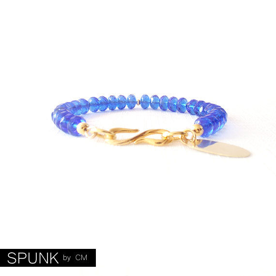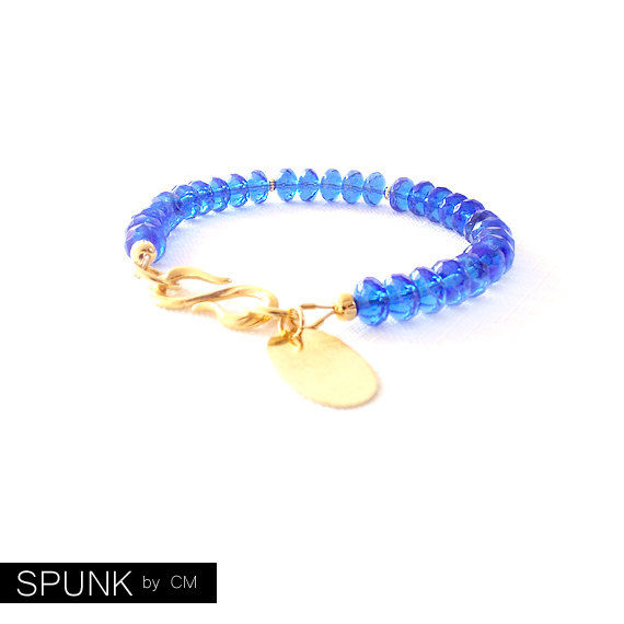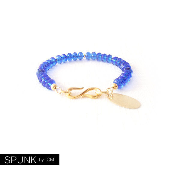 Gold Beaded Bracelet - Personalized Charm Tag - Czech Glass Beads - Tanzanite Blue - The Bohemian: December Birthstone 7x5mm Rondelle