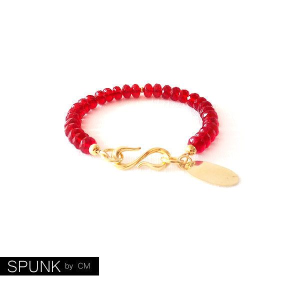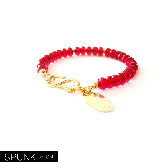 Sparkling, faceted, ruby red rondelle Czech glass beads with speckles of gold are a luxurious combination. Ruby is the July birthstone, which makes this a lovely birthstone bracelet. A hassle-free clasp closes this bracelet for effortless style and ease. An oval, gold charm tag dangles on the end. Charm tags are handstamped for a uniquely individual feel to each piece. Personalize your charm tag with your own initials.