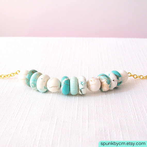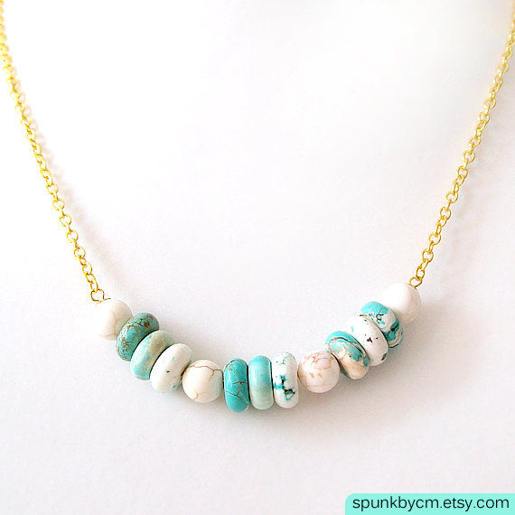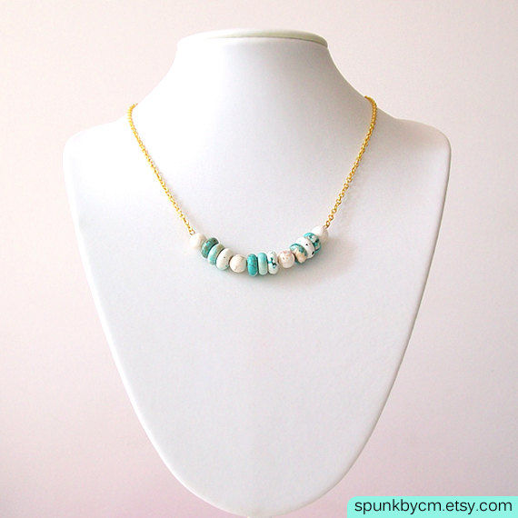 This necklace features turquoise and white magnesite gemstones that have been centered on a sparkling gold chain. The refreshing flush of cool colors creates a unique look to this piece, while still maintaining a minimalist appeal. The gold brings out these colors by creating a contrast that exudes elegance. This necklace can be worn on its own, or layered with other necklaces. I often find myself wearing this necklace alone because it adds that dash of color to my white blouses and dresses; it gives it that boho chic look without trying too hard. It's perfect for those hot summer days when you want to accessorize without weighing yourself down. If you're having a summer or beach wedding, this necklace would be a wonderful bridesmaid necklace. A simple piece with so much character. We recently made these for a summer beach wedding.